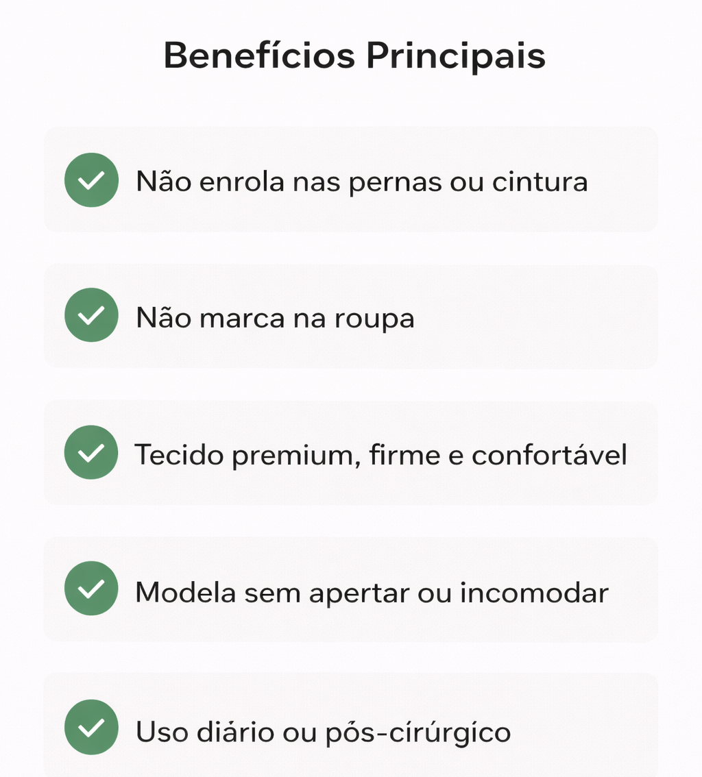 Compressão firme e confortável que modela barriga, cintura, quadril e culote.