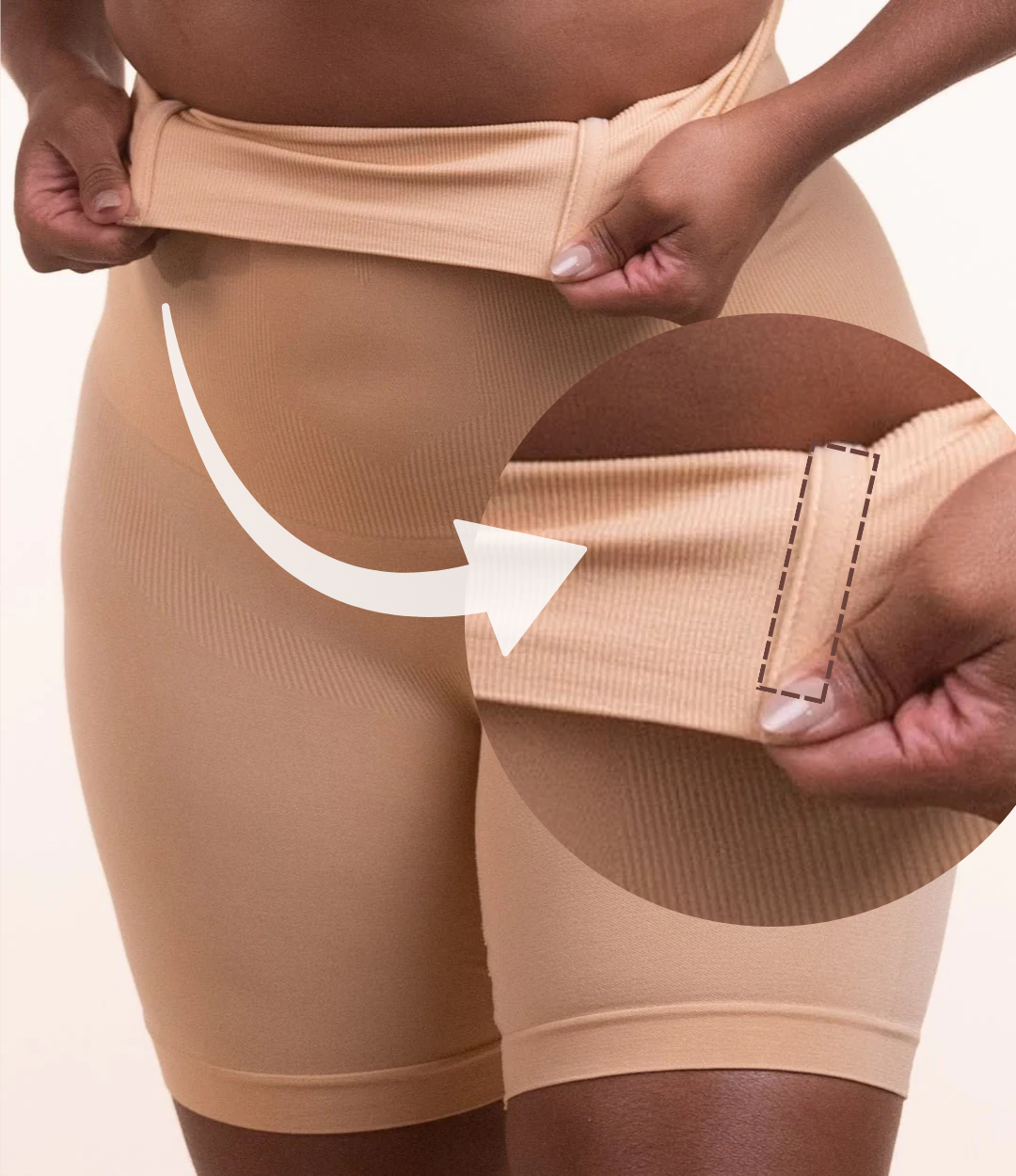 Acabamento invisível que não marca, não aparece e não cria volume — ideal para usar com qualquer look, saia, calça, bermudas, shorts até os mais justos.